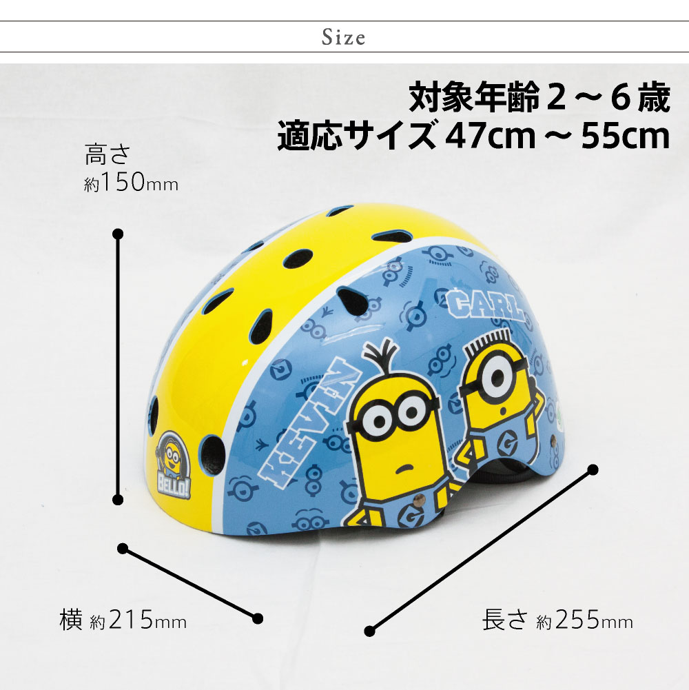 あごひもがからまないから、ひとりでかぶれちゃう! ■対応サイズ:47〜55cm ■対象年齢:2歳〜6歳くらい ■サイズ:幅215mm×奥行255mm×高さ150mm ■ヘルメット本体: プラスチック ■あごひも: ナイロン ■内装パッド: PE【日本郵便のゆうパックでお届けします】 かぶるだけでミニオンズになれる『ミニオンズ』のかわいいヘルメットです ハードシェルで、安心のSG規格合格商品 調整ダイヤルがついているので、2-6歳まで使えます。