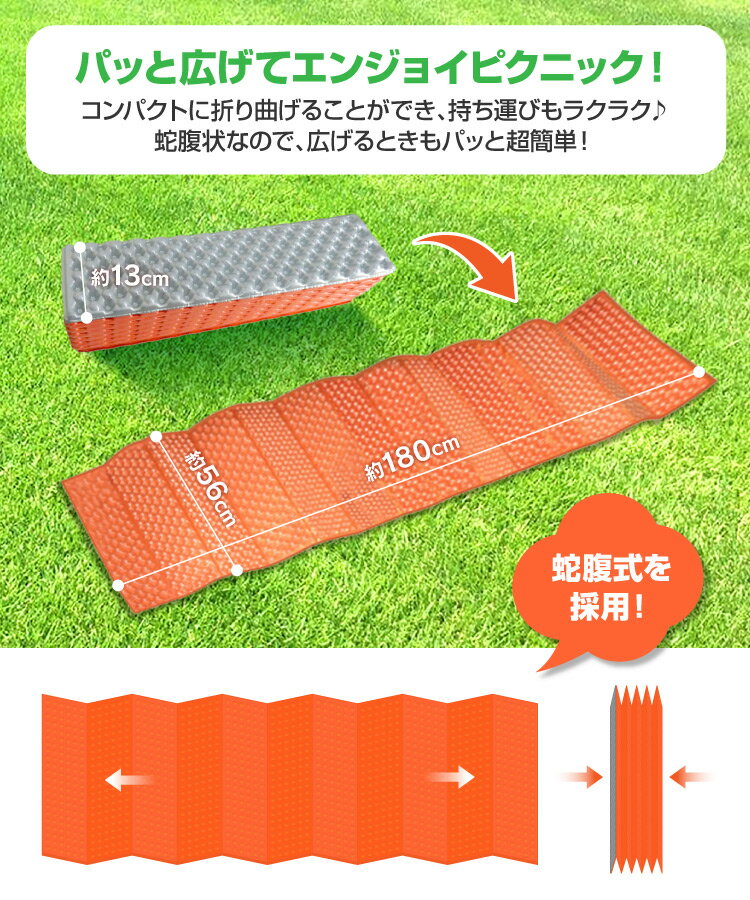 商品説明 ピクニックや遠足、キャンプやバーベキューに最適! キャンピングレジャーシートが登場! 運動会などのイベントで大活躍! ・コンパクトに折りたたみ可能! ・マットや寝袋の下に敷いて寝心地アップ! ・凹凸製法によって地面と直感触や湿気、冷気をカット! 凸部に空気層ができることで断熱性がアップ! ・ヨガマットやトレーニングマットとしても! 【サイズ】 ・広げた時:約180cm×約56cm、厚み:約2cm ・収納時:約13cm×約56cm 【素材】 発泡ポリエチレン 【カラー】 オレンジ 【セット内容】 キャンピングレジャーシート×1 ご注意 ※弊社は商品の生産メーカーではございませんので、商品にはサポートができないことをご理解下さい ※返品・交換は到着後1週間以内に限り弊社で対応します ※初期不良品は同製品と交換となります ※交換可能な場合は、返品等は受付ができません ※交換品が無い場合は、送料等を含め、全額返金、返品対応とさせて頂きます商品名 折りたたみ レジャーシート 商品説明 ピクニックや遠足、キャンプやバーベキューに最適! キャンピングレジャーシートが登場! 運動会などのイベントで大活躍! ・コンパクトに折りたたみ可能! ・マットや寝袋の下に敷いて寝心地アップ! ・凹凸製法によって地面と直感触や湿気、冷気をカット! 凸部に空気層ができることで断熱性がアップ! ・ヨガマットやトレーニングマットとしても! サイズ ・広げた時:約180cm×約56cm、厚み:約2cm ・収納時:約13cm×約56cm 素材 発泡ポリエチレン カラー オレンジ 【ご注意】 ※弊社は商品の生産メーカーではございませんので、商品にはサポートができないことをご理解下さい ※返品・交換は到着後1週間以内に限り弊社で対応します ※初期不良品は同製品と交換となります ※交換可能な場合は、返品等は受付ができません ※交換品が無い場合は、送料等を含め、全額返金、返品対応とさせて頂きます