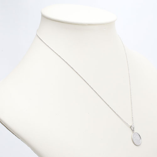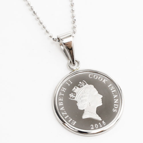 オーストラリアのパースミント製、クック島発行の純プラチナ、ホワイトローズコインにプラチナ900のシンプルフセコミ枠を巻き、イタリア製のシルバーカットボールチェーンをセットしたコインペンダント。