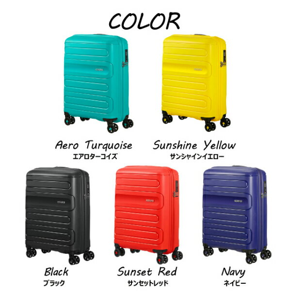 ■商品詳細メーカー名:Samsonite American Touristerシリーズ名:Sunside(サンサイド)サイズ:55×40×20cm容量:35L重量:2.5kgキャスター4輪カラー:エアロターコイズ(Aero Turquoise)、ネイビー(NAVY Navy)、サンシャインイエロー(Sunshine Yellow)、ブラック(Black)、サンセットレッド(Sunset Red)購入単位:1台配送種別:在庫品【検索用キーワード】107526-4842 107526-1596 107526-1844 107526-1041 107526-0409 K01824 K01825 K01826 K01827 K01828 K01858 サムソナイト アメリカンツーリスター サンサイド 55cm Samsonite American Tourister Sunside Spinner 35L エアロターコイズ AEROTURQUOISE Aero Turquoise ネイビー NAVY Navy サンシャインイエロー SUNSHINEYELLOW Sunshine Yellow ブラック BLACK Black サンセットレッド SUNSETRED Sunset Red ブランド ブランド雑貨 旅行鞄 旅行カバン スーツケース 旅行 海外旅行 4輪 TSAロック ポリカーボネート ポリカーボネイト